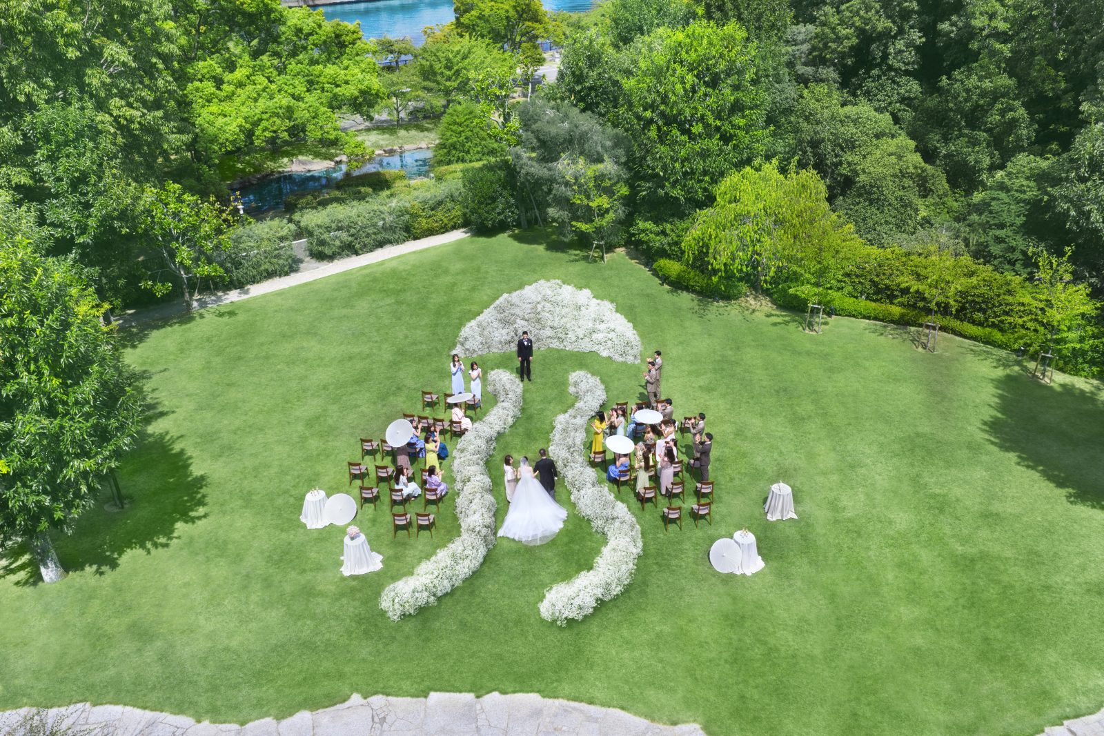 都会から切り離された深い緑に包まれる庭園。4,000坪にも広がる庭園では、四季折々の自然に囲まれ、まるで静穏の森にいるかのような深い安らぎを覚えます。壮麗な芝生の庭を利用したガーデン挙式も可能です。